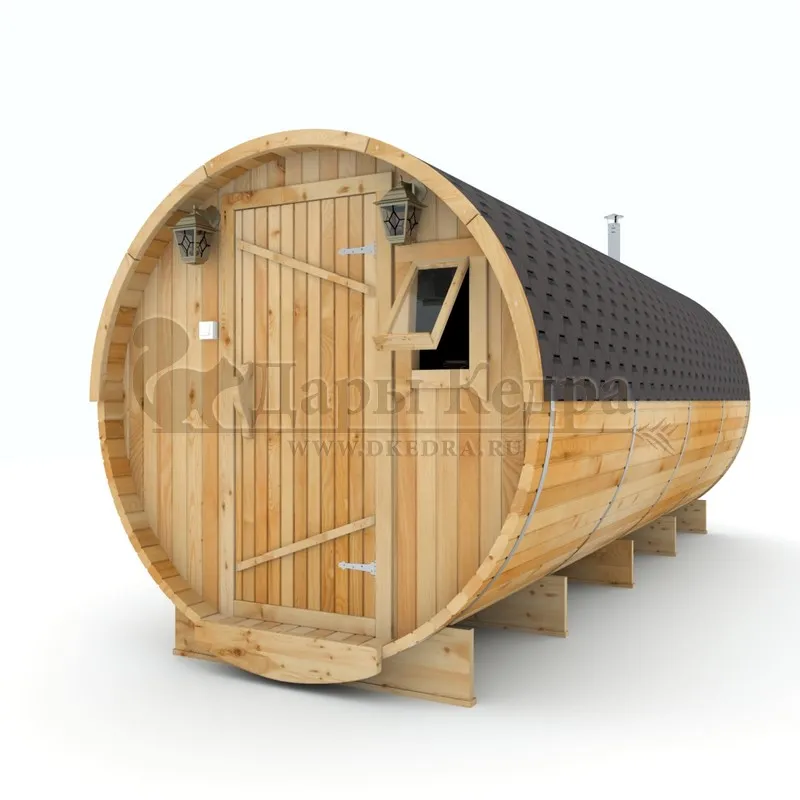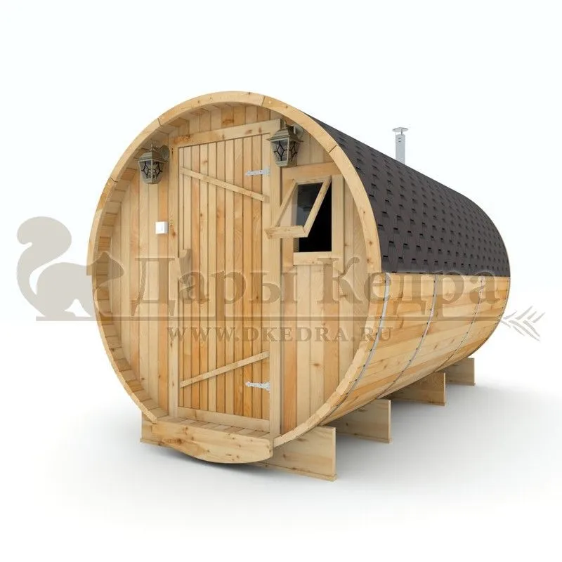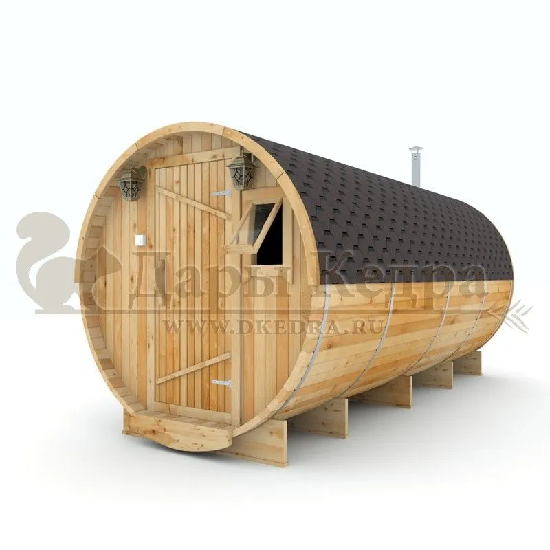 Баня-бочка круглая из кедра с верандой (все размеры) Это изделие круглой вытянутой формы. На веранде можно оставить вещи или отдохнуть после процедур парения. Лавочки из кедра находятся по всей длине бани-бочки с обеих сторон. Печь расположена в парилке около дальней стены. Время растопки такой печи не превышает 30 минут. В зависимости от выбранного размера круглая баня-бочка с козырьком имеет следующую комплектацию: Круглая баня-бочка 2,5 метра - парилка; Круглая баня-бочка 3,5 и 4,5 метра - раздевалка, парилка; Круглая баня-бочка 5,5 метров - раздевалка, парилка, моечная. По вашему желанию ее можно укомплектовать печью с внешней загрузкой, благодаря которой весь мусор вовремя топки остается на улице. Круглая баня-бочка не требует полноценный фундамент, поэтому при необходимости ее можно перенести в другое место. Обращаем Ваше внимание, что в стандартную комплектацию бани входят лавки в парной с обеих сторон. Дополнительно можно заказать полок открытого или закрытого типа! Кедр обладает ароматическими свойствами. Он не деформируется и влагоустойчив, при правильном уходе за деревом на нем не развиваются грибки и плесень.