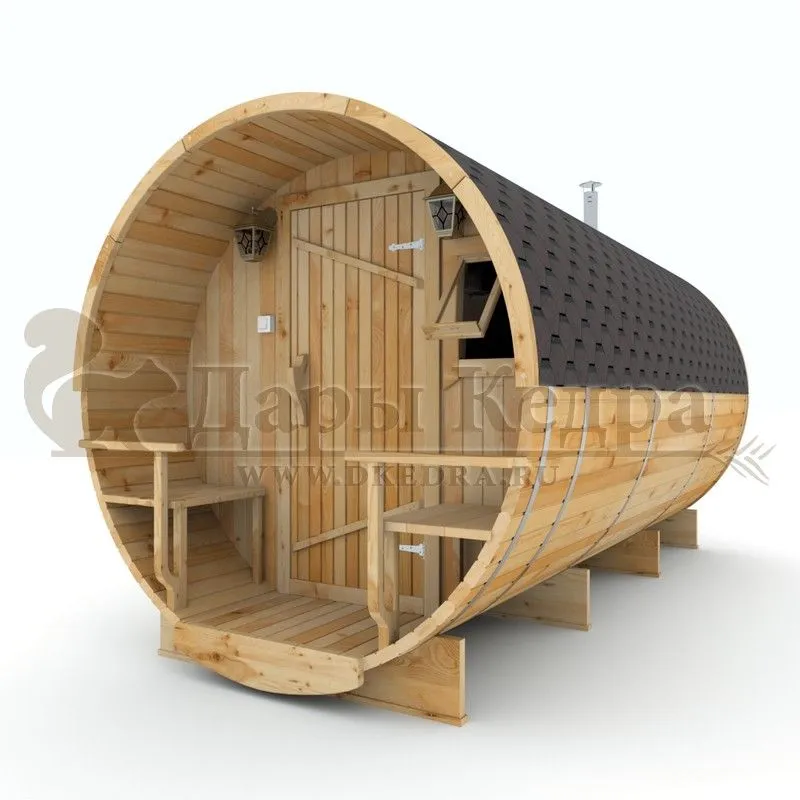 Баня-бочка круглая из кедра 3 метра Это изделие круглой вытянутой формы с двумя отделениями: раздевалкой и парной. Лавочки из кедра находятся по всей длине бани-бочки с обеих сторон. Печь расположена в парилке около дальней стены. Для удобства пользования в раздевалке установлена вешалка и полочка из кедра. За счет небольшой конструкции баня нагревается не более 30 минут. По вашему желанию баню-бочку можно дополнить печью с внешней загрузкой, благодаря которой весь мусор после топки останется на улице. Круглая баня-бочка не требует полноценный фундамент, поэтому при необходимости ее можно перенести в другое место. Обращаем Ваше внимание, что в стандартную комплектацию бани входят лавки в парной с обеих сторон. Дополнительно можно заказать полок открытого или закрытого типа! Кедр обладает ароматическими свойствами. Он не деформируется и влагоустойчив, при правильном уходе за деревом на нем не развиваются грибки и плесень.