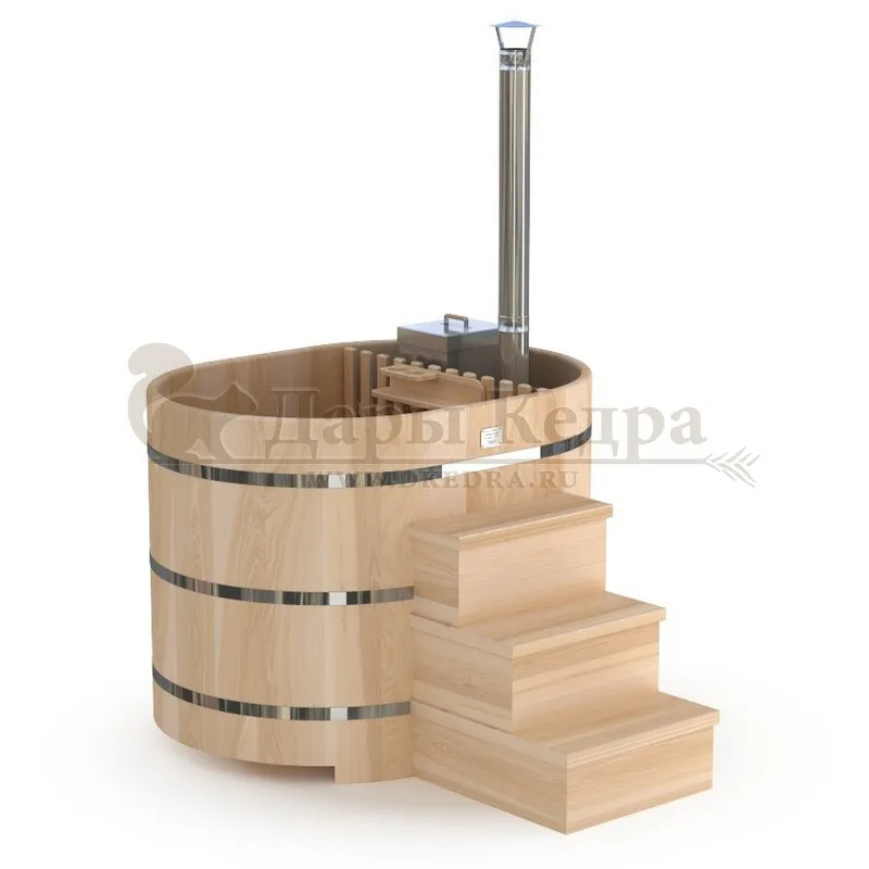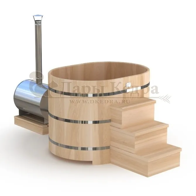 Фурако овальная из кедра с внешней печью Это уличная баня, которой можно пользоваться круглый год. Купель представляет собой овальную емкость для воды, внутри которой располагаются сиденья из кедра. Подогрев воды осуществляется за счёт внешней печи с дымоходом, которая подключается с помощью шлангов с выходом внутри термостойких форсунок. Для удобства пользования японская баня фурако оборудована внешней и внутренней лестницей из кедра. Целебная древесина кедра богата фитонцидами и эфирными маслами, которые активируются при нагревании. Таким образом, во время процедур парения организм насыщается полезными веществами.