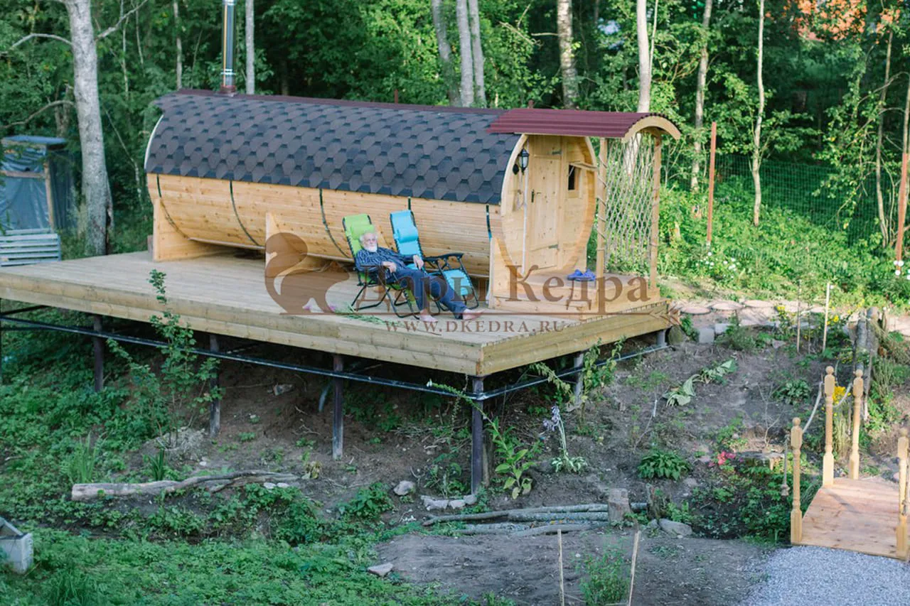 Круглая, квадратная баня-бочка из кедра изготавливается путем набора клепки по кругу со стяжными ремнями. Каркасно-щитовая парилка представляет собой набор щитов, которые складываются между собой в определенной последовательности. В любом случае и та, и другая баня являются облегченными и могут быть установлены на ровною площадку, без строительства капитального фундамента. Главное условие - это хорошая вентиляция дна конструкции. Площадка должна быть выложена тротуарной плиткой или другими материалами, которые обеспечат отсутствие травы, земли. Опоры, на которые устанавливается мобильная парилка, должны быть обработаны пропиткой против гниения и не соприкасаться напрямую с землей и травой, которые затрудняют воздухообмен.